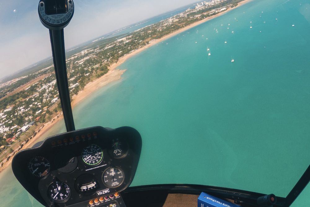 Take in the beauty of Darwin city and harbour before continuing along the stunning coast of the Cox Peninsula. Look out for turtles, crocodiles and sharks through the crystal clear azure waters contrasting with white sandy beaches and red rock cliffs. We fly around Charles Point lighthouse and over the magnetic termite mounds before returning to Darwin via Mandorah and the crocodile breeding grounds of Talc Head.